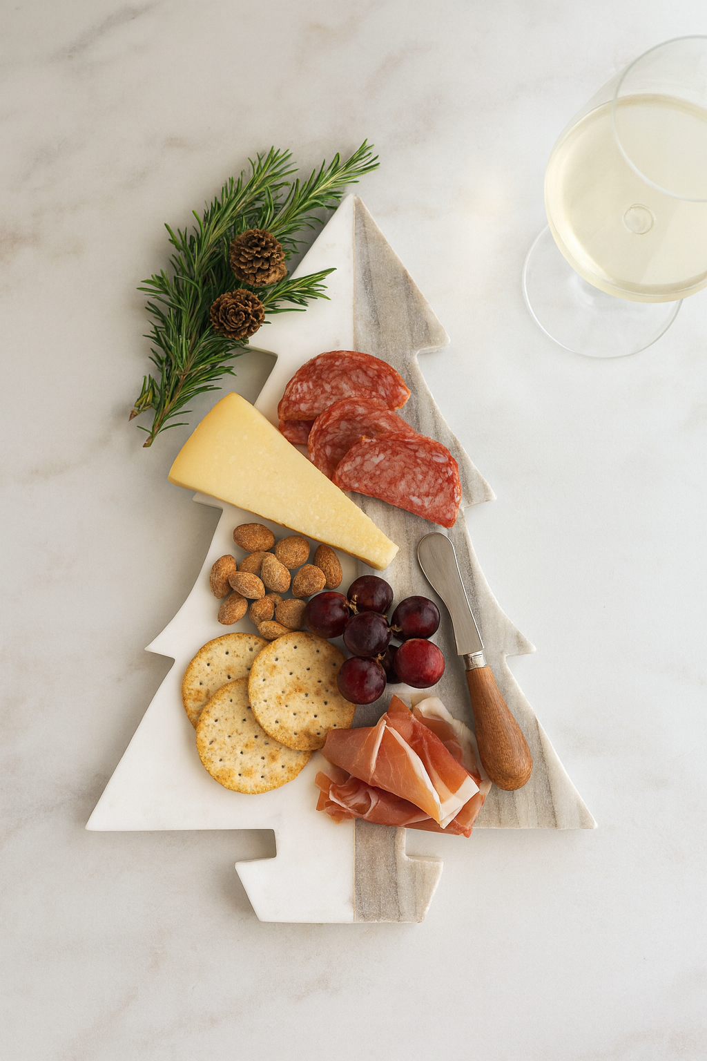 Carved from solid, two-toned marble, the Marble Christmas Tree Board from Pepper + Vetiver brings sculptural elegance to holiday entertaining. Each piece showcases natural veining in soft grey and ivory hues—making every board a one-of-a-kind work of art. Paired with a hand-tied serving knife featuring a smooth wooden handle, it’s the perfect canvas for brie, charcuterie, or festive garnishes.