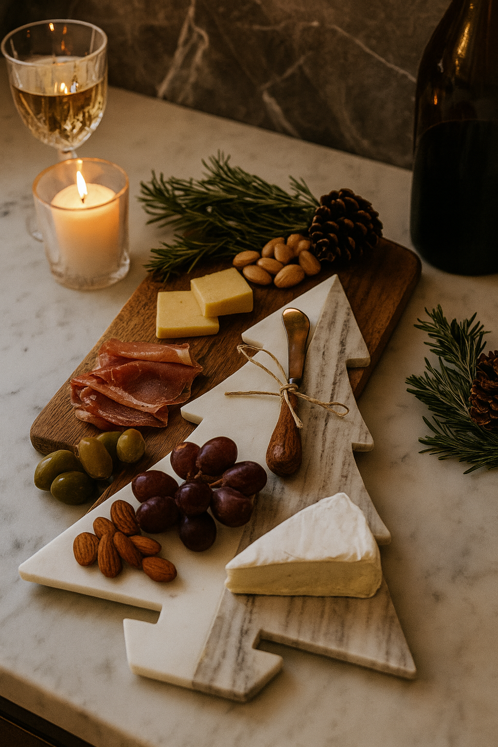 Handcrafted from natural marble and richly textured glass, these essentials blend modern luxury with festive charm. From serving charcuterie to mixing cocktails, every detail invites warmth, style, and connection.